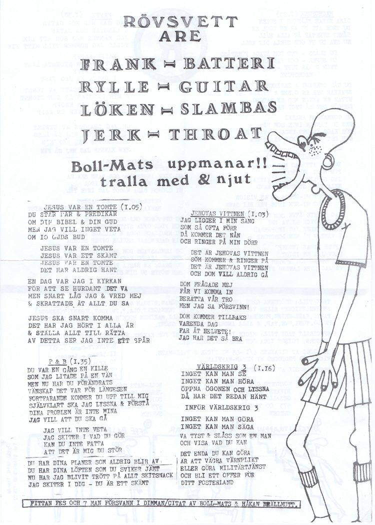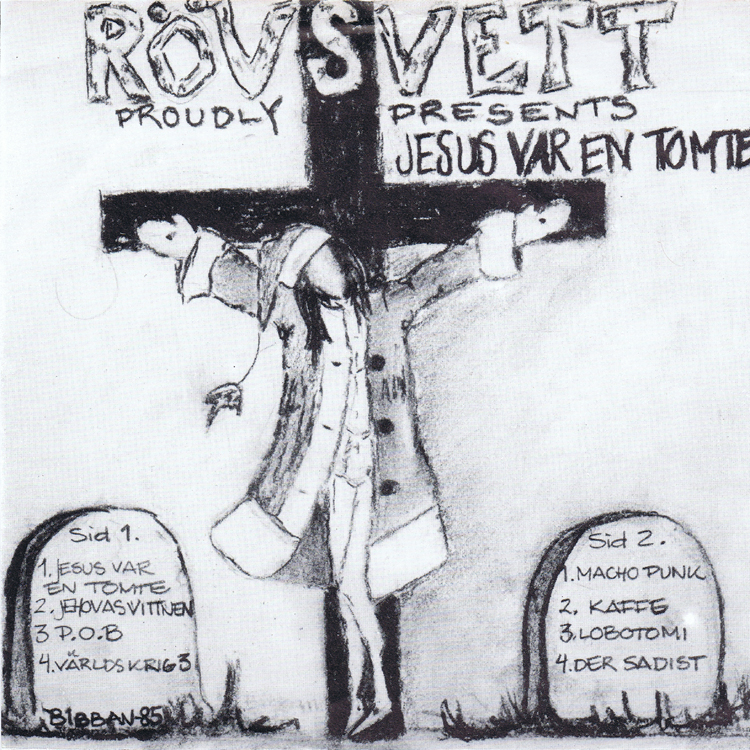 7" Jesus var en tomte Recorded at KLOAKENS ALTERNATIVA ANTI-STUDIO Recorded by Micke Blomqvist and Boll-Mats Tracks: 01 Jesus var en tomte 02 Jehovas vittnen 03 P.O.B 04 Världskrig 3 05 Macho Punk 06 Kaffe 07 Lobotomi 08 Der Sadist THANKS! Approved by Rövsvett (Mikael "Löken" Karlsson)